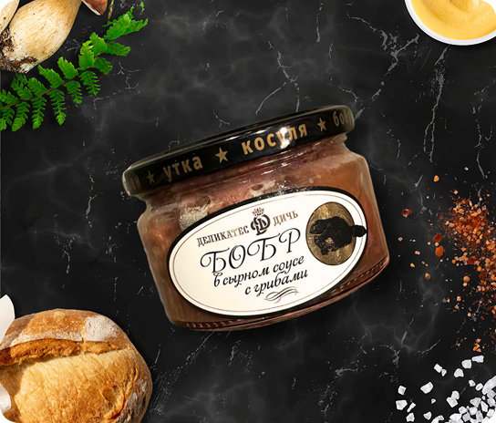 Томленое мясо Бобра, в сырном соусе, с грибами